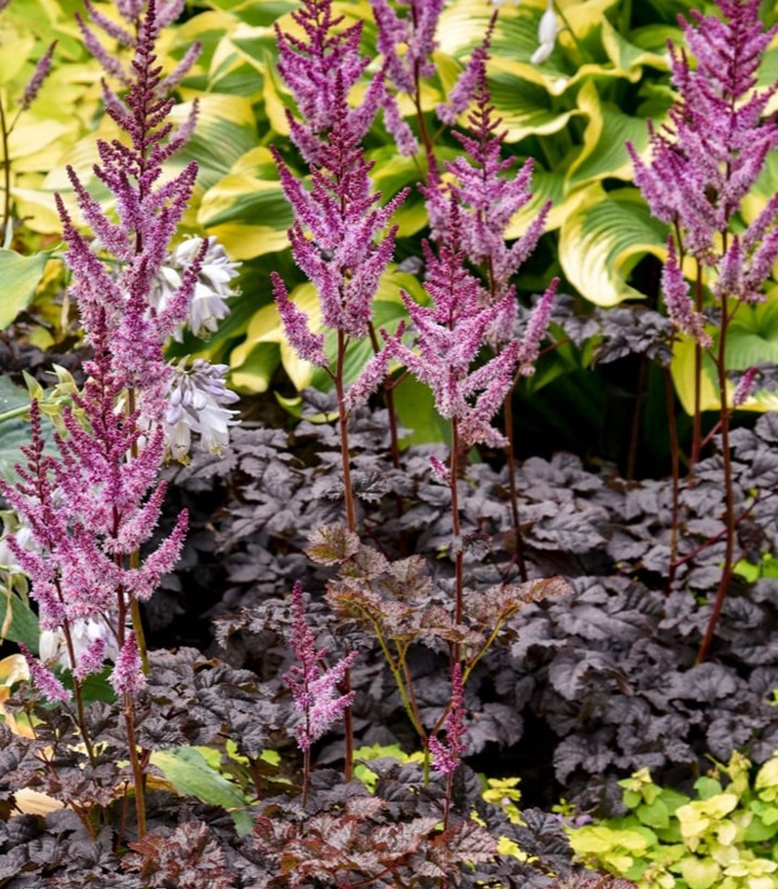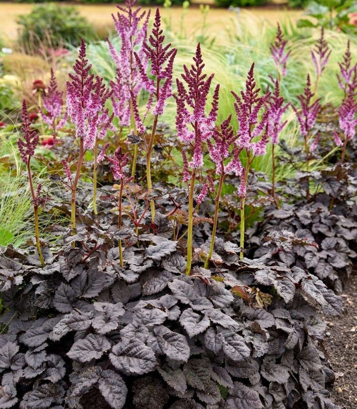 Это первый сорт астильбы с сиренево-фиолетовыми цветками и очень темной листвой. Отличается поздним цветением. Молодая листва коричнево-желтая с темными прожилками, по мере отрастания становится шоколадно-коричневой и сохраняет свой цвет на протяжении всего сезона. Невероятно эффектная астильба, настоящая изюминка в саду.