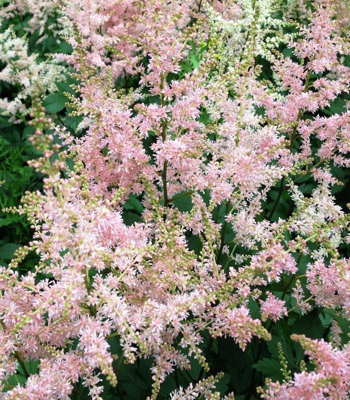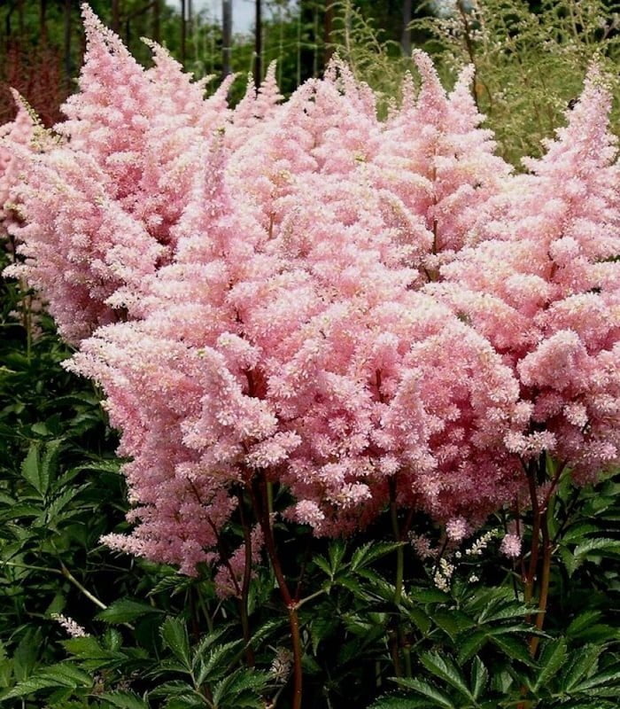 Астильба Нью Вейв – это сорт с неповторимой, почти акварельной окраской соцветий: от светло-лавандового до перламутрово-розового. Цветение длится с июля по август, украшая сад воздушными метёлками высотой до 50 см. Листва тёмно-зелёная, с глянцем и резным краем, придаёт кусту элегантный и ухоженный вид.