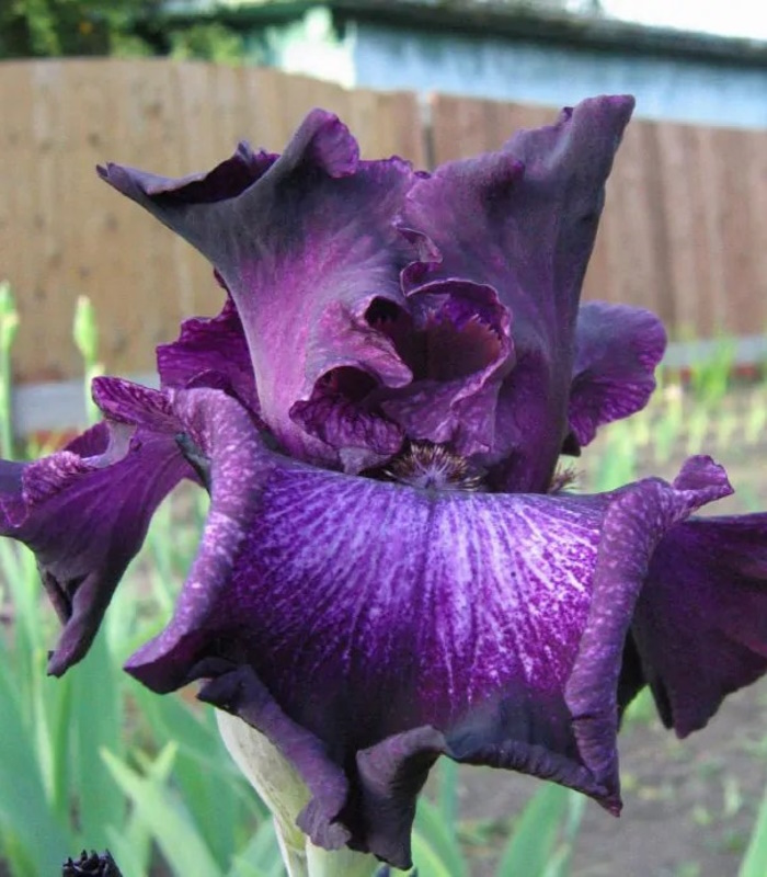 Сливово-пурпурный с белым «разрисованным» полем пликаты на фолах. Бородка пурпурная. Аристократическая окраска. Цветок идеальной формы. Цветоносы высокие, стройные. Приятный легкий аромат.
