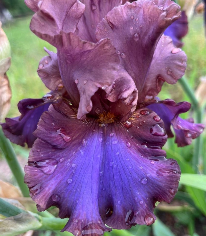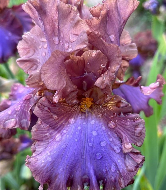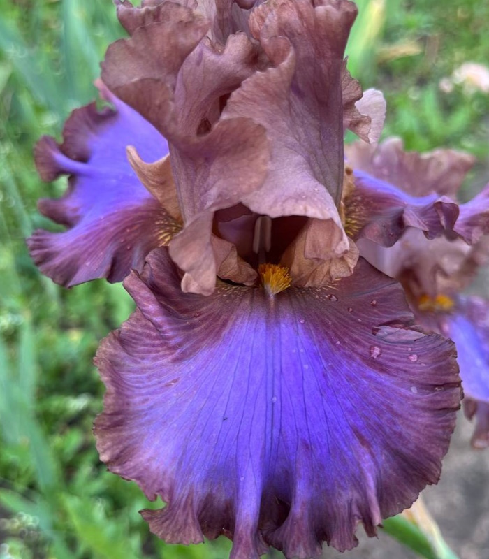 Потрясающий сорт украинской селекции! Дымчато-серебристо-коричневые стандарты, ультрамариновые фолы с каймой цвета стандартов. Бородки — желто-оранжевые. Великолепно гофрированный шедевр!