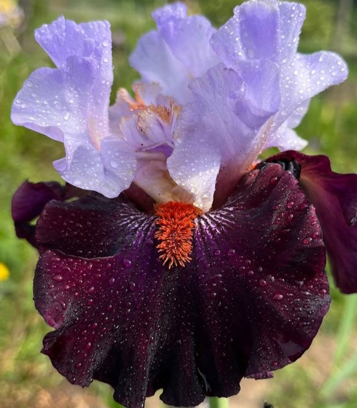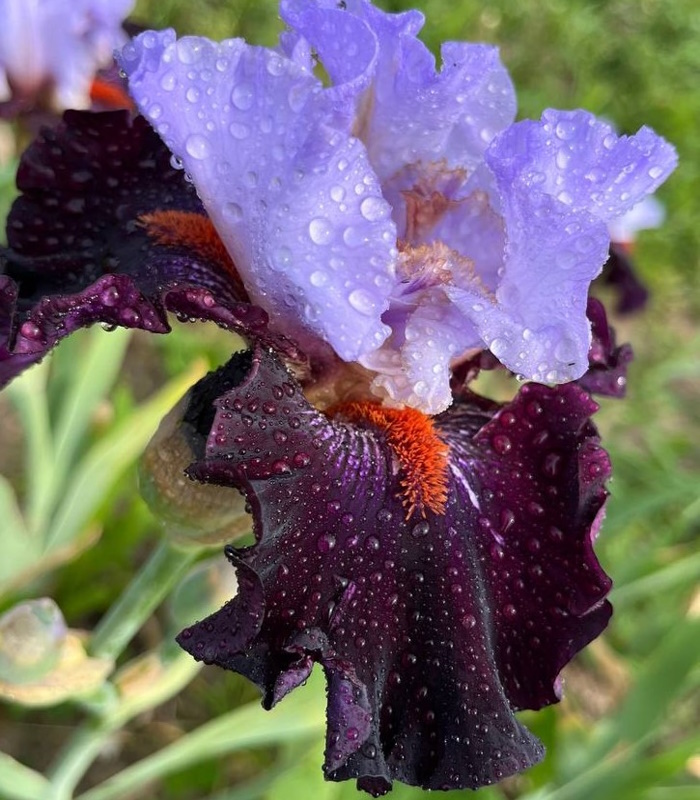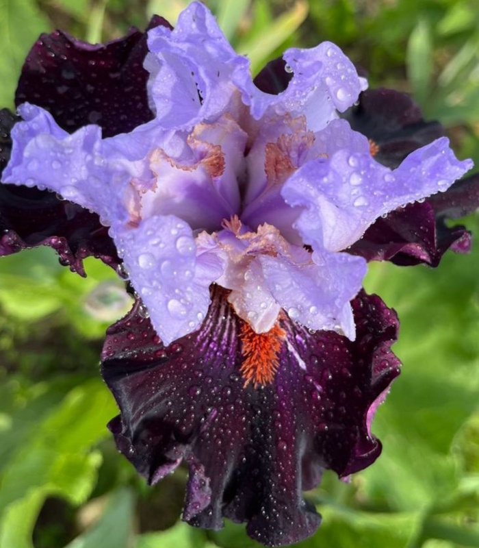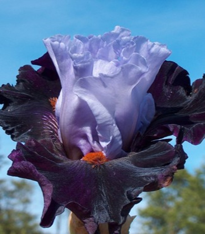 Стандарты молочно-белые с темно-пурпурными пятнышками в основах и слабыми сине-фиолетовыми вливаниями по центру. Фолы бархатные, сине-фиолетовые по центру и винно-черные ближе к краям. Небольшое белое штрихование вокруг мандариновых бородок. Роскошно гофрированный!