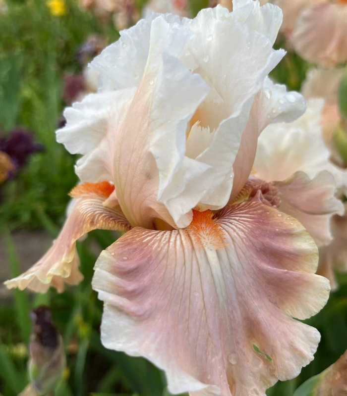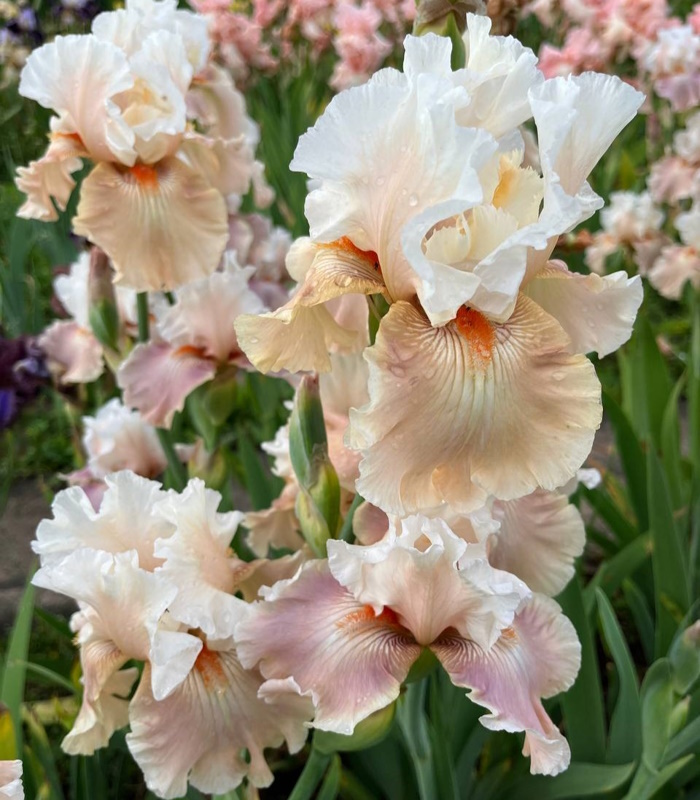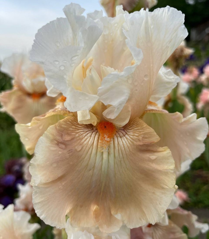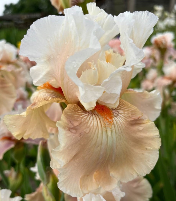 Стандарты белые с легким розовым наплывом у основания, фолы — кремово-белые с легким розовым напылением и ярко-оранжевой бородкой. Исключительно эффектный сорт!