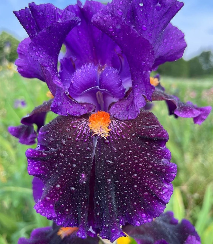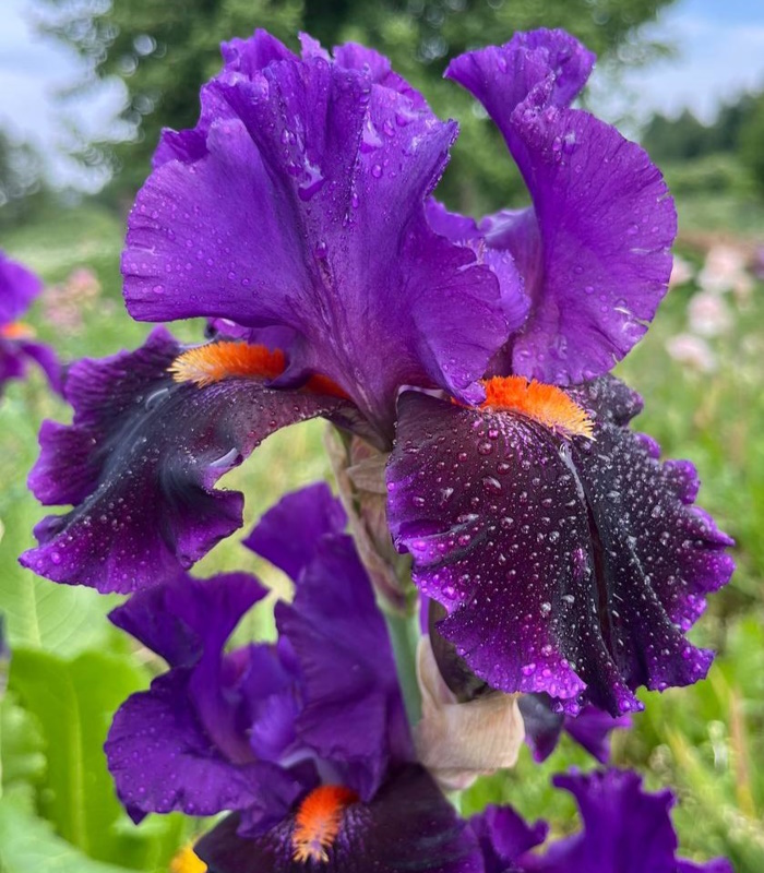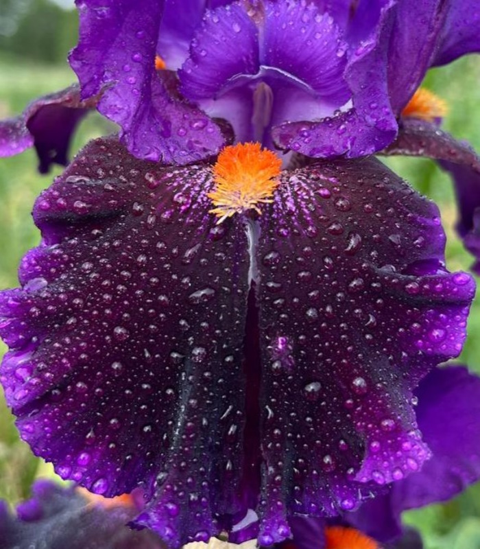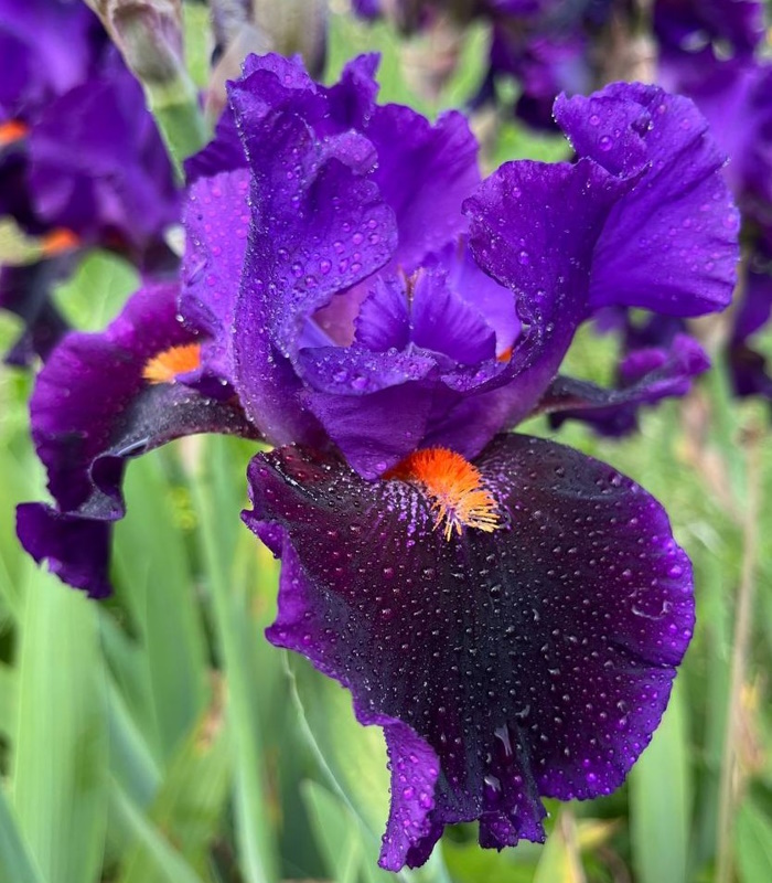 Очень эффектный двухтонный: среднего тона сиренево-фиолетовые стандарты переходят в темно фиолетовые фолы с заметной светлой каймой по краю и контрастной оранжевой бородкой.