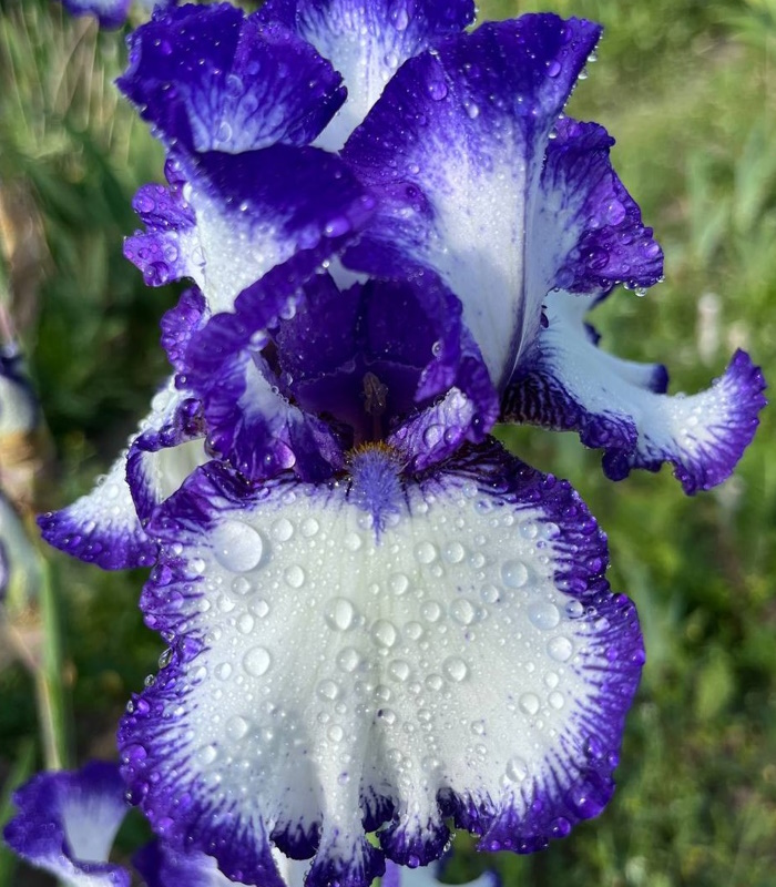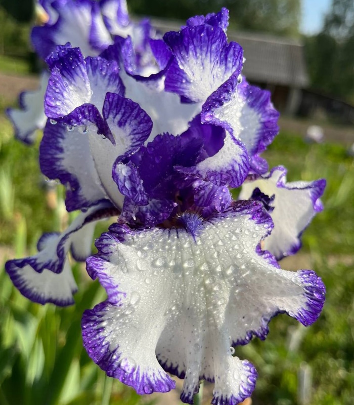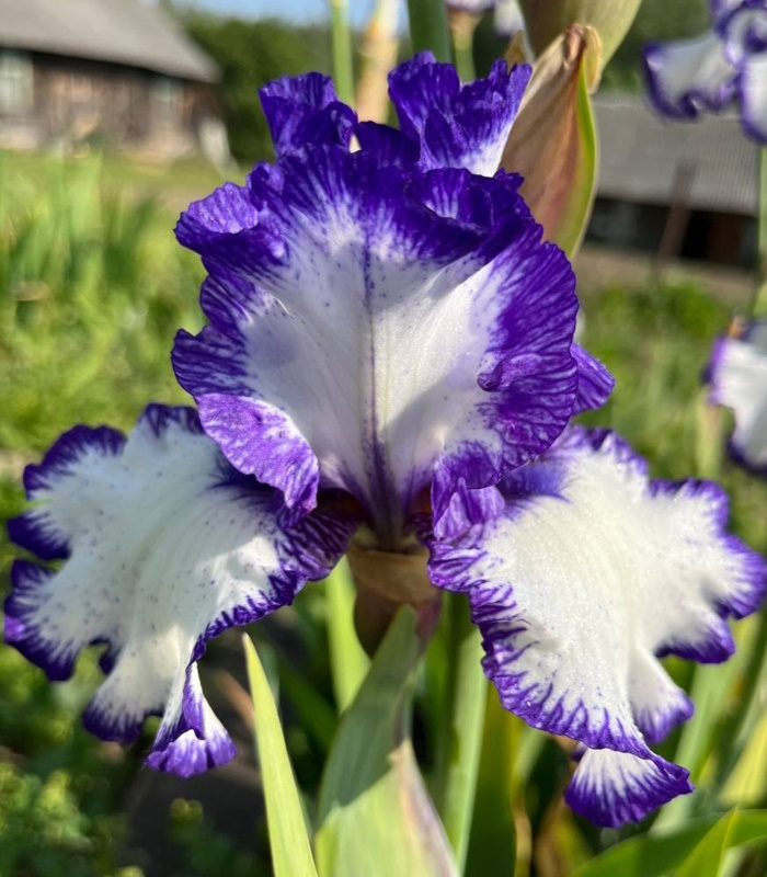 Стандарты и фолы одинаковые: на белом поле васильково-синяя кайма пликаты. Бородки синие. Красивая волнистая гофрировка. Потрясающий яркий сорт!