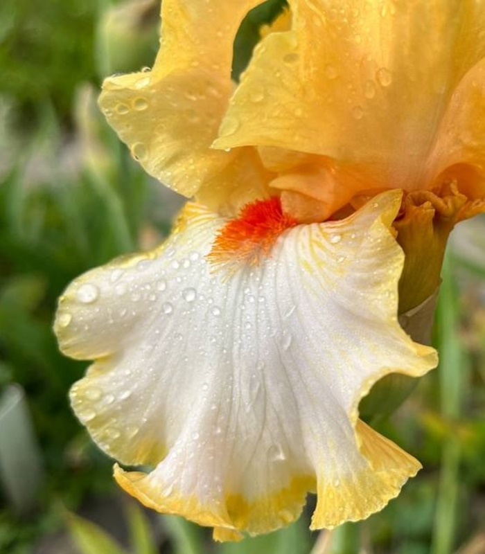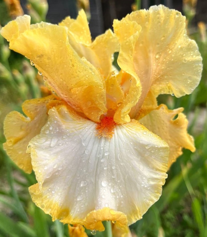 Стандарты абрикосово-желтые; фолы — кремово-белые с абрикосово-желтой каймой; бородка — оранжево-красная. Изящно гофрированный сорт с нежной расцветкой!