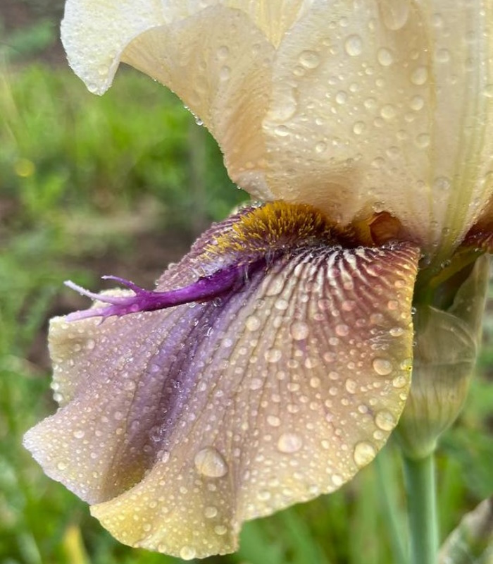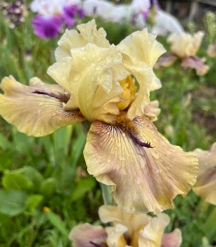 Светло-бежевые стандарты, фолы – зеленовато-горчичные с фиолетовыми жилками. Горчичная бородка заканчивается фиолетовым «рогом». Редкая окраска «рогатого» ириса.