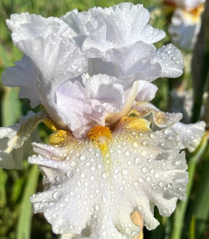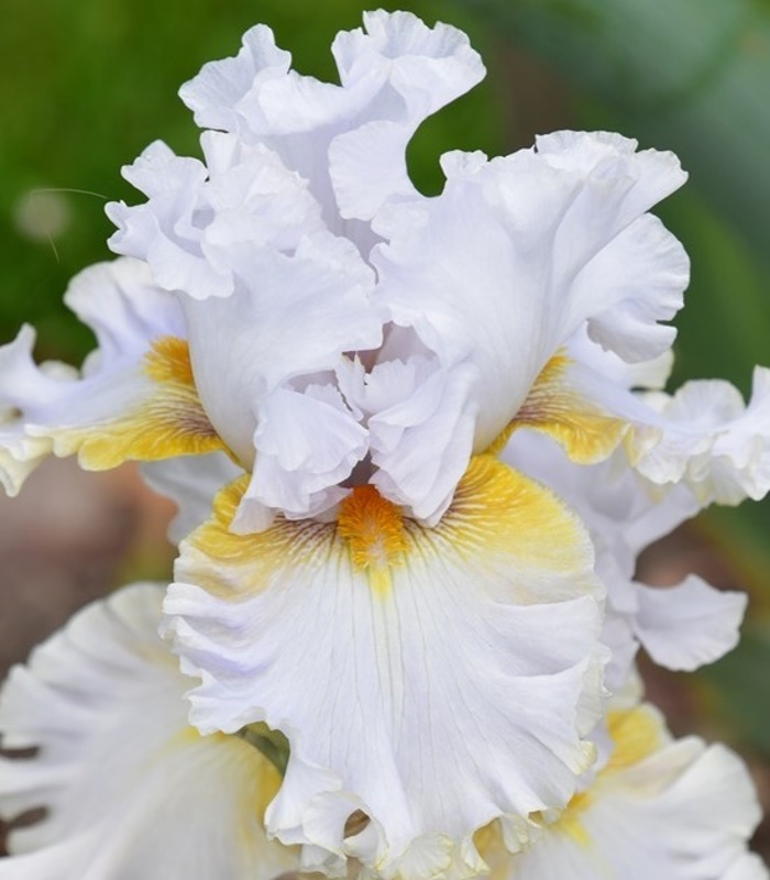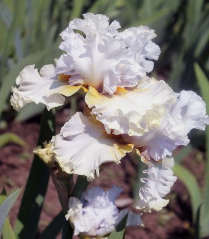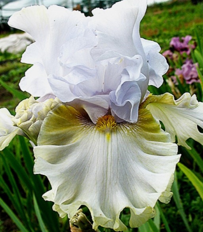 Стандарты чисто-белые, фолы кремово-белые с лёгким лимонным вливанием ближе к плечикам, бородки горчично-золотистые. Экстремально гофрированный!