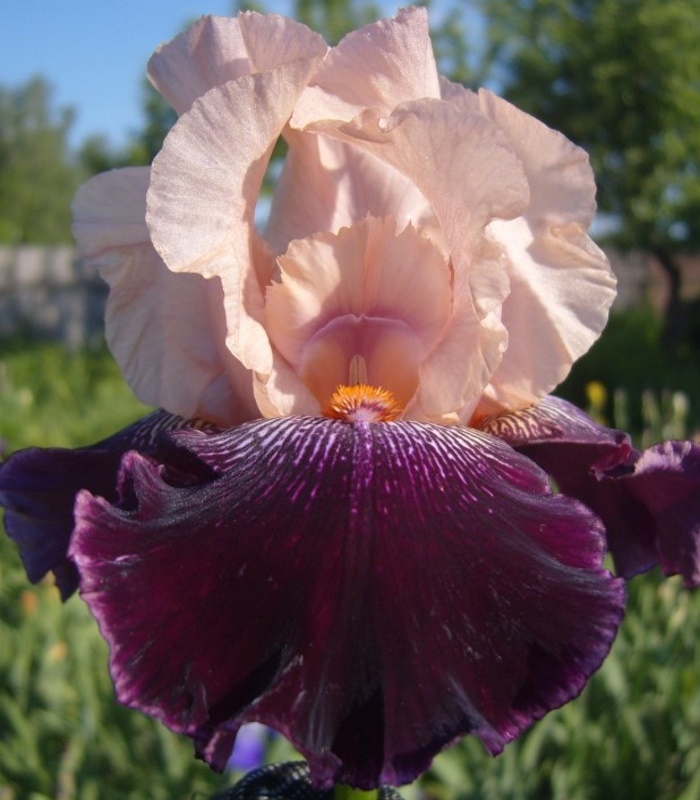 Светло-розоватые стандарты и темно-сливовые фолы с выразительным белым рисунком вокруг яркой мандариновой бородки. На фолах заметна тонкая светло розовая кайма.