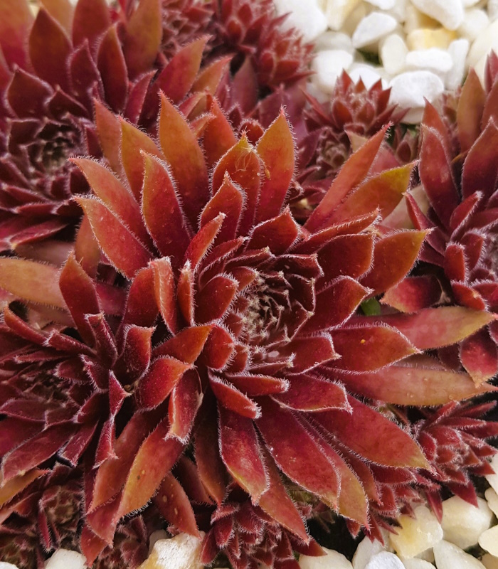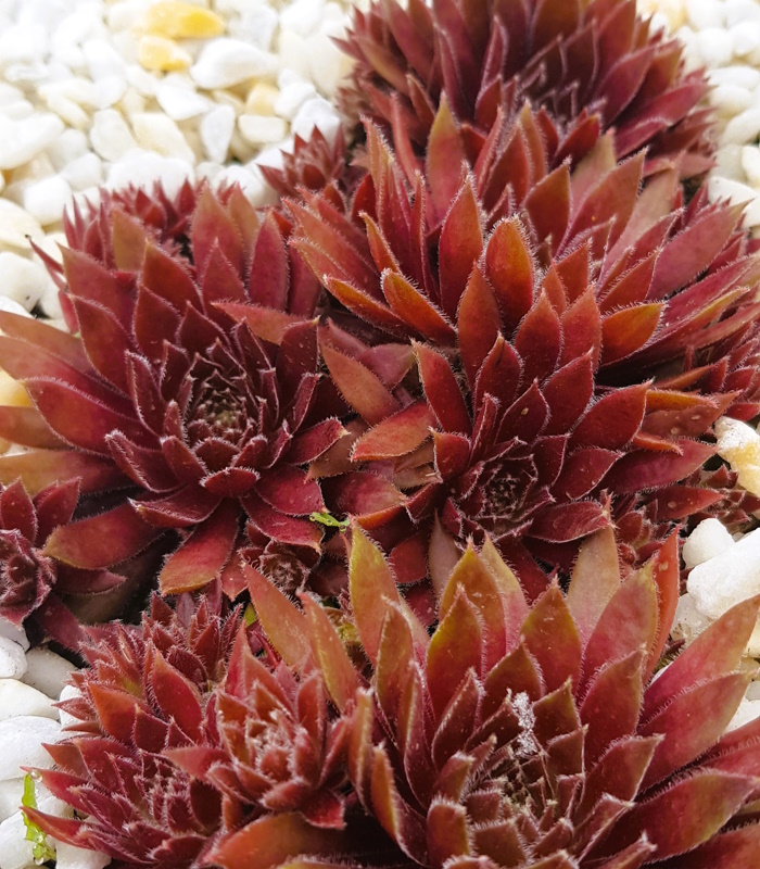 Молодило Ред Эйз – декоративное многолетнее растение из семейства толстянковых, известное своей яркой и контрастной окраской, устойчивостью к внешним условиям и компактной формой розеток. Розетки у сорта плотные, симметричные, диаметром до 9-10 сантиметров, состоят из мясистых, заострённых листьев с гладкой поверхностью. Особенность сорта – сочетание бордового, малинового и пурпурного оттенков в центральной части розетки, плавно переходящих в зелёные или оливковые тона по краям. Весной цвет особенно насыщен, летом он становится мягче, а осенью вновь приобретает глубину и выразительность.
