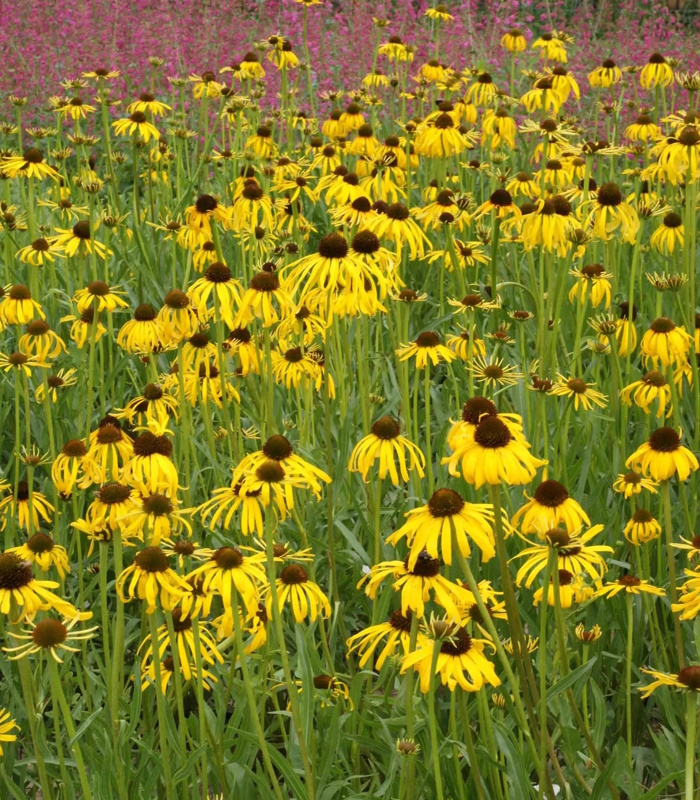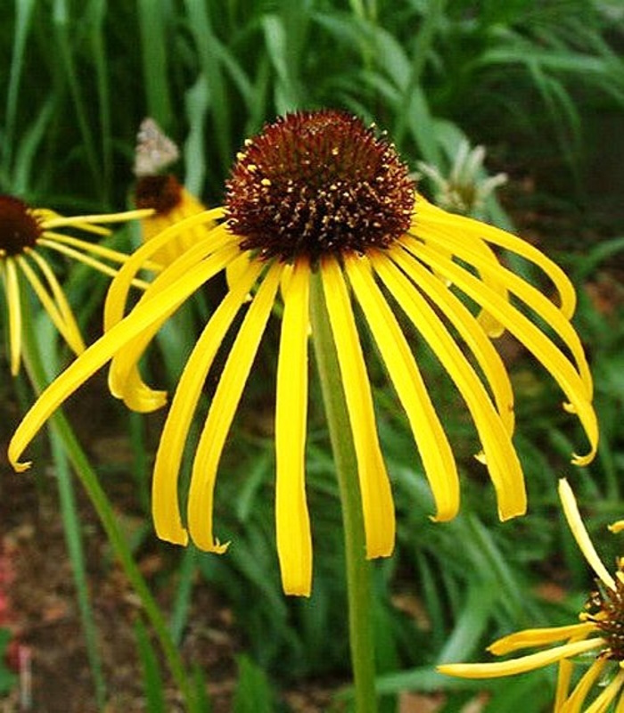 Редкая и необычная эхинацея, отличающаяся очень крупными насыщенно-желтыми цветками на длинных прочных цветоносах и светло-зеленой продолговатой листвой ланцетной формы. Тонкие изогнутые лепестки цветков обрамляют выпуклый коричневый центр в виде конуса, что смотрится невероятно эффектно. Также эта эхинацея очень продолжительно цветет и прекрасно будет смотреться в сочетании с декоративными злаками, создавая яркий акцент и привлекая в сад бабочек и пчел.