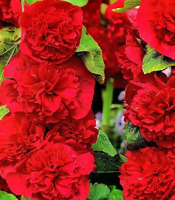 Эффектный сорт мальвы с крупными махровыми цветками насыщенного красного цвета, собранными в пышные вертикальные соцветия на прочных стеблях. Засухоустойчивое неприхотливое растение отличающееся продолжительным и обильным цветением. Прекрасно будет смотреться в групповых посадках, добавляя вертикальный акцент в цветниках.