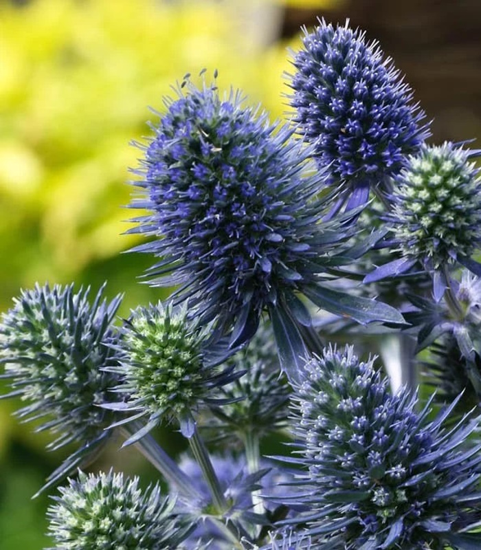 Синеголовник Блю Хоббит – компактный многолетник с необычной окраской и архитектурной формой, способный стать выразительным акцентом в любом саду. Это карликовый сорт высотой всего 25-35 см, с прочными прямыми стеблями и серебристо-зелёными кожистыми листьями. Цветки – насыщенно-синие с фиолетовым оттенком, собраны в головчатые соцветия диаметром до 2 см, окружённые колючими прицветниками. Цветение начинается в июле и продолжается до сентября, придавая участку динамику и глубину. При высоких температурах окраска становится особенно интенсивной, создавая эффект свечения.