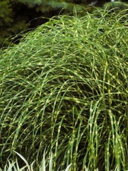 Мискантус гигантский – монументальное декоративное растение из семейства Злаковые, создающее в саду мощные вертикальные акценты и дарящее ощущение масштабности. Это один из самых крупных сортов мискантуса, достигающий в высоту 250-300 см, с широкой и плотной розеткой листвы, эффектно возвышающейся над остальной растительностью. Листья длинные, узкие, светло-зелёные с характерной белой полосой вдоль центральной жилки, осенью приобретают оттенки бронзы и меда, сохраняя декоративность до зимы.