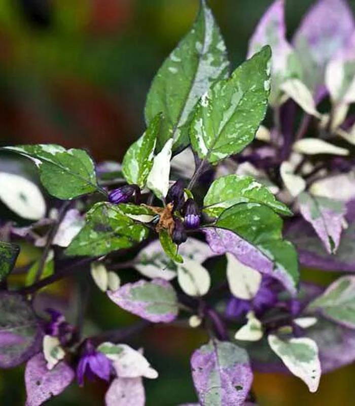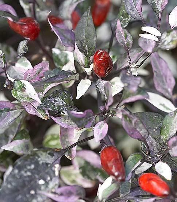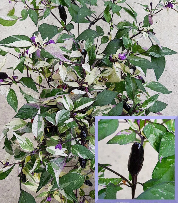 Перец ситцевый пестролистный, вариегатный. Перец декоративный острый, высотой 30 см. Изящно вытянутые узкие перчинки, торчащие вверх, напоминают рождественские свечи, меняющие окраску по мере созревания. Растения привлекательны не только разноцветными огоньками созревших плодов, но и пестрой вариегатной листвой. Может выращивать, как многолетник.