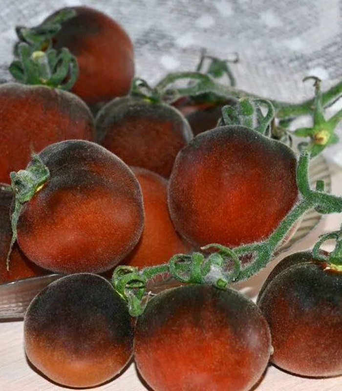 Среднерослый, среднеранний экзотический сорт от Тома Вагнера. Куст крепкий, листва голубоватого цвета с сильным опушением. Плоды округлые, до 100 грамм, по 5-6 в кистях . Поверхность плодов имеет лёгкое опушение. Плечики и бочка коричнево-чернильные , верхушка ярко-жёлтая. Урожайный, красивый, вкусный. Пригоден для свежего потребления, вяления, консервирования.