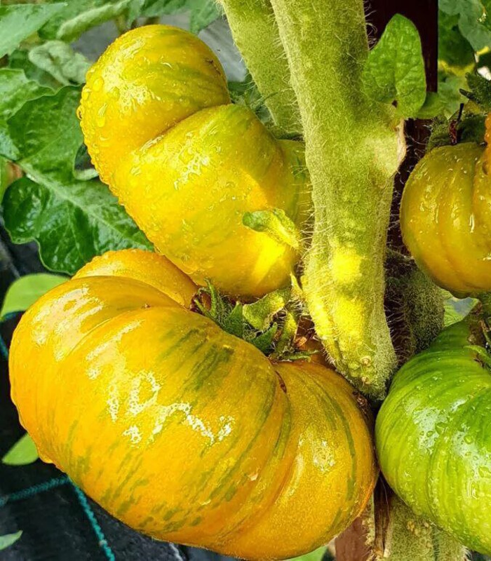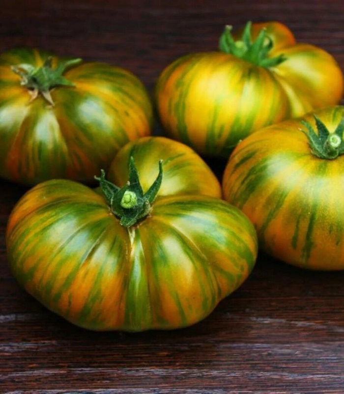 Среднерослый (высота 1-1,2 м), среднеспелый. Лист картофельного типа. Плоды охристо-оранжевые с зелеными штрихами, плоскоокруглые массой 120-250 грамм, с великолепным вкусом и удивительным ароматом.