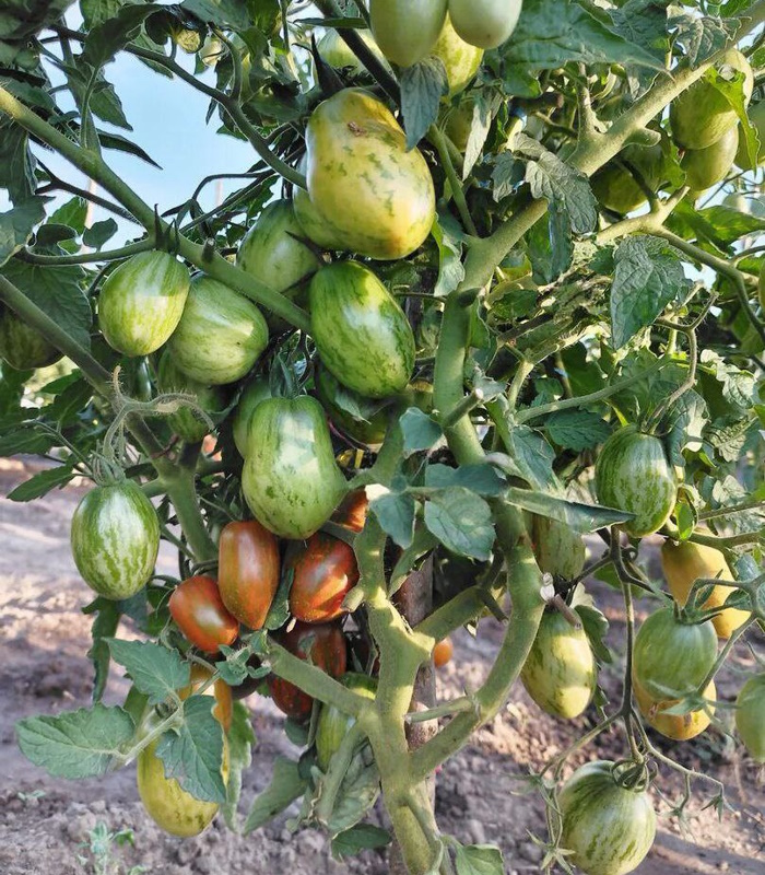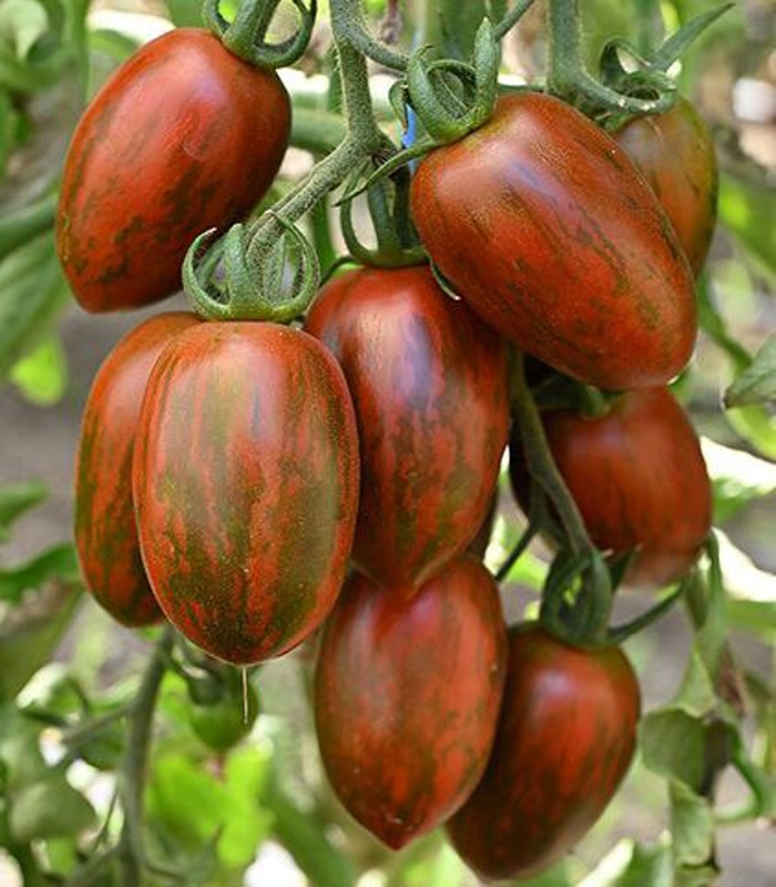Очень красивый сорт из Проекта Гном Томатный — скороспелый и продуктивный карлик. Детерминантные растения с обычными листьями, можно выращивать в горшках (от 10 л) высота не более 60-70 см. Плоды удлиненные, сливовидной формы, шоколадного цвета (темно-красный фон с зелеными плечами) имеют зеленые полоски, мякоть густая, толстые стенки, сочные и имеют мягкий, сбалансированный вкус. Массой 60 — 100 грамм. Не требует пасынкования. Для салатов, соков, консервации, вяления.