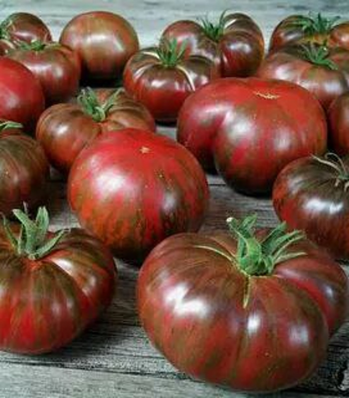 Плоды плоскоокруглой формы, фиолетово-коричневые с зелёными и золотистыми полосками, массой до 300 грамм. Вкус насыщенный, гармоничный, со сладостью.