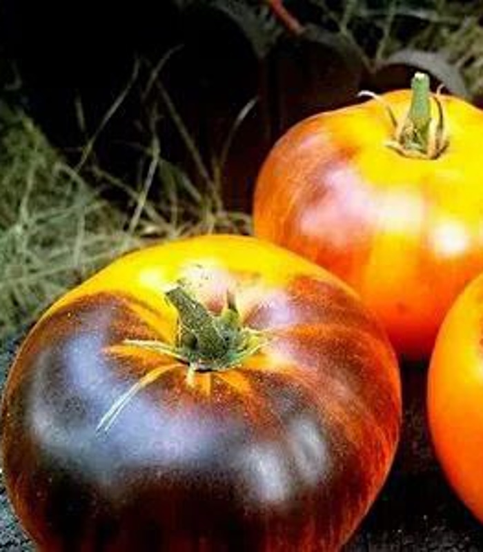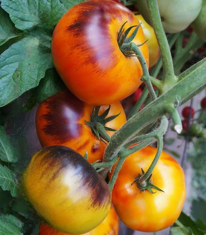 Коллекционный сорт Американской селекции салатного назначения. Среднеспелый, индетерминантный, высота в теплице до 200 см. Куст мощный, стебель толстый, лист простой смотрят в стороны, занимает много места. Кисти длинные, в которых 4-6 плодов, весом 200 -350 грамм. Плоды плоскоокруглой формы с небольшой ребристостью у плодоножки, ярко оранжево-красного цвета с антоциановой шапочкой по плечам. Мякоть желто-оранжевого цвета, очень сочная, мраморная, мармеладная, нежная. Вкус сладкий с фруктовой ноткой, кислинка отсутствует. Кожица эластичная, плоды не растрескиваются. Томат очень урожайный, устойчивый к болезням.