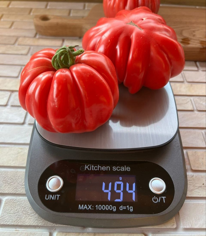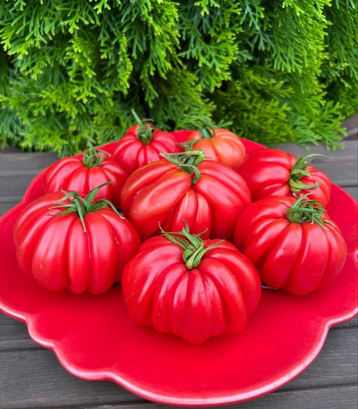 Плоды плоскоокруглые, часторифленые, ярко-красные. Вес 200-300 грамм. Мякоть плотная, мясистая, малосочная, сладкая.