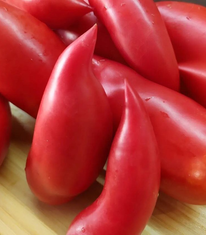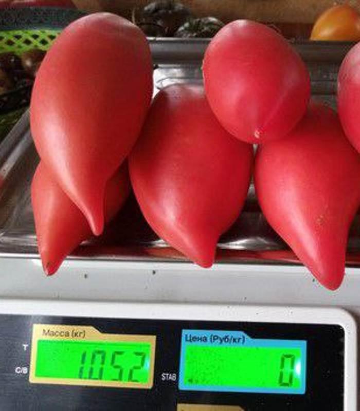 Высокорослый, среднеспелый, показывает отличную урожайность как в теплицах, так и в открытом грунте. Растения с лиановидными стеблями, требуется хорошая опора, чтобы куст не рухнул под тяжестью поистине огромного урожая. Плоды — удлинённые с длинным смешным носиком, в полной спелости ярко-розовые (в ОГ, при солнечной погоде окраска плодов может «играть» — от розовой до малиново-красной). Мякоть плотная, сахаристая, сочная. Вкус превосходный — насыщенный томатный, сладкий с едва заметной кислинкой. Вкусные!